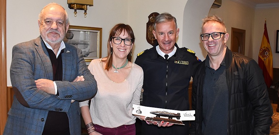 El almirante Alejandro Cuerda ha recibido el singular dulce cartagenero elaborado en honor al sumergible inventado por Isaac Peral de manos de sus creadores, Antonio Sánchez Munar, gerente de la confitería 'San Vicente' y su hermana Begoña, gerente de la confitería 'Paseo'.