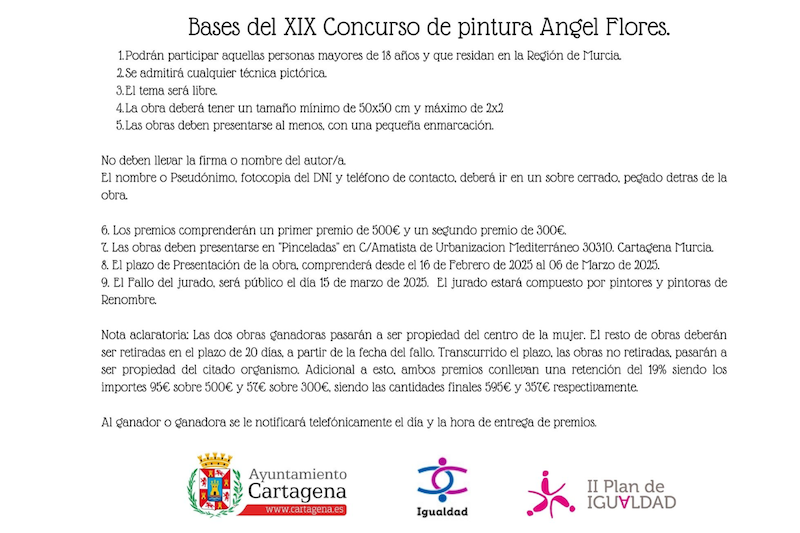 El Centro de la Mujer de Urbanización Mediterráneo, con la colaboración del Ayuntamiento de Cartagena, convoca el XIX concurso de pintura Ángel Flores. Los interesados podrán presentar sus obras desde el próximo 16 de febrero hasta el 6 de marzo.