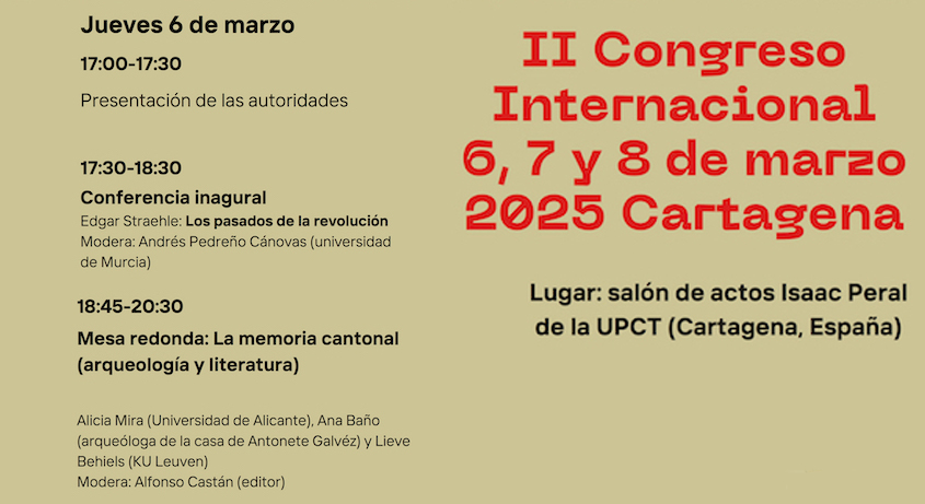 Tendrá lugar , bajo el título 'La revolución cantonal en Cartagena: ecos dela sublevación', en el salón de actos 'Isaac Peral' de la UPCT del jueves 6 al sábado incluyendo en su programa de actividades conferencias, mesas redondas, ponencias y una visita guiada cultural.