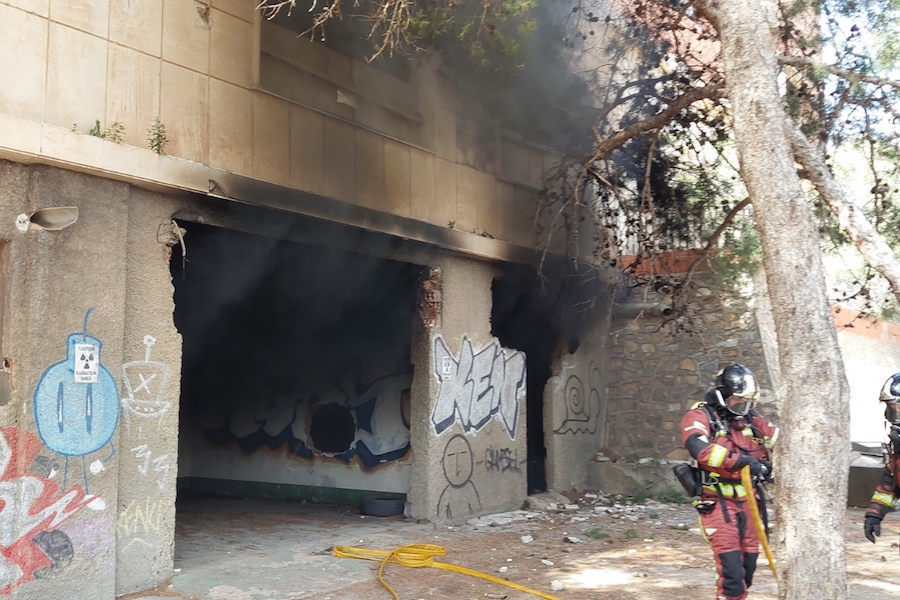 Bomberos del Ayuntamiento de Cartagena intervinieron la tarde del 2 de mayo en el incendio de un vehículo estacionado en una zona de almacén del antiguo cuartel de La Guía que se emplea para las actividades de una empresa de airsoft.