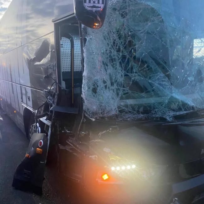 El autocar, de regreso de Zaragoza, se encontró, sobre las cinco horas de la madrugada, con una colisión múltiple en la autovía, logrando el conductor, con gran destreza, esquivar los dos primeros turismos, pero no a un camión, contra el que colisionó. No hay heridos, sólo daños materiales.