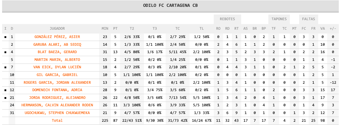 Estadística del Odilo FC Cartagena CB: