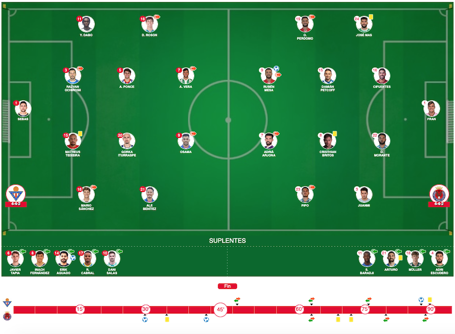GOLES. 0-1. Minuto 31: Rubén Mesa con un chut desde la frontal del área. 0-2. Minuto 45: Rubén Mesa. 1-2. Minuto 89: Erik Aguado.