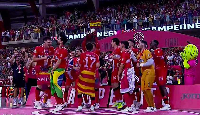 Gon Castejón robó el esférico al contrario, probó fortuna y el balón acabó en córner. Tomaz lo saca enviando el balón casi al centro del campo, desde donde remata Cortés y desvía el esférico Pablo Ramírez para alojarlo en el fondo de la meta (pinchar aquí). Si antes era júbilo ante era éxtasis. Se agotaron los últimos 18 segundos sin que el Barça rematase... ¡Campeones¡ Abrazos y todo el público en pie. ¡El pabellón bota!. Por segundo año consecutivo, Cartagena luce la corona de campeón de la Liga Nacional de Fútbol Sala.