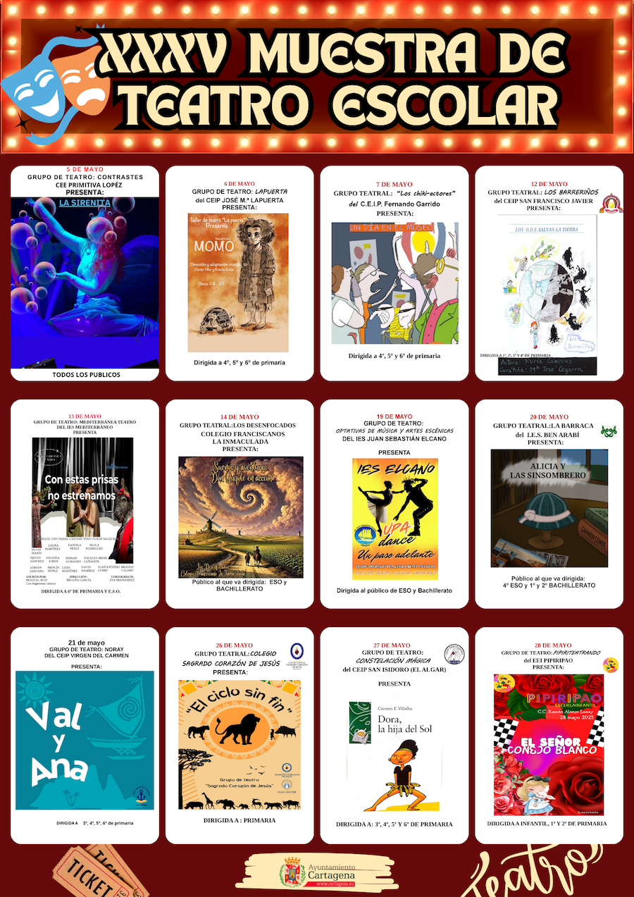 El edil ha explicado que en esta edición "serán 12 centros educativos, incluyendo institutos y colegios, los que mostrarán las funciones que han estado ensayando a otros miles de alumnos del municipio". De esta manera, ha recordado que la iniciativa continúa con la línea impulsada por Educación del Consistorio, "de acercar las artes escénicas y sus valores, en este caso el teatro, a los más jóvenes de Cartagena".