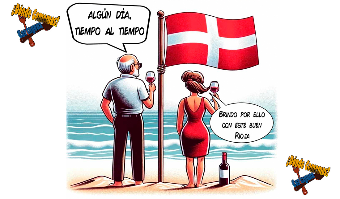 Un brindis y un deseo a la orilla del Mediterráneo junto a la bandera de Cartagena como capital marítima Este asunto ha merecido esta simpática caricatura del portal ‘¿Dónde comemos?, Cartagena’, que dirigen Aida Belmonte y Enrique Costa.