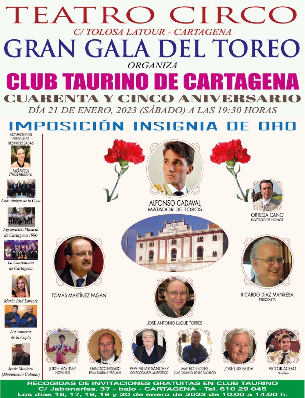 El Nuevo Teatro Circo será el marco donde se celebra la gran gala del toreo, a partir de las 19.30 horas, con el extorero cartagenero como invitado de honor y entrega de insignias de oro al matador de toros Alfonso Cadaval, a Tomás Martínez Pagán, José Antonio Luque y Ricardo Díaz Manresa, entre otros. También habrá siete artistas o grupo que protagonizarán el capítulo musical. En la foto adjunta, Manuel Juárez, presidente del Club Taurino de Cartagena.