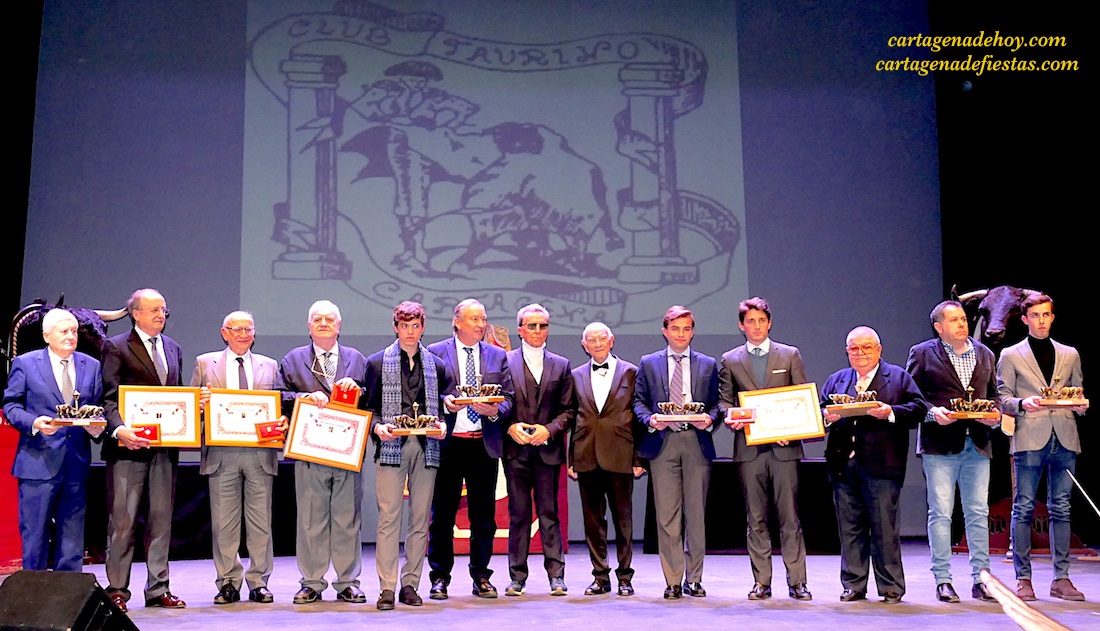 Lo primero es plasmar el cartel, encabezado por el presidente del club, Manuel Juárez, y su equipo de trabajo, para después reseñar que recibieron las insignias de oro el activo 'influencers social cartagenero' Tomás Martínez Pagán, el periodista Ricardo Díaz Manresa, el médico José Antonio Luque Torres, el empresario José Luis Belda, Francisoc navarro (Peña Taurina Yeclana), Pepe Villar Sánchez (coleccionista museístico), Mateo Inglés (Club Taurino Torre Pacheco) y los novilleros Jorge Martínez y Víctor Acebo, que eran representantes del mundo del toreo en primer línea junto a Alfonso Cadaval, matador de toros que recibió la alternativa en 2018, habiéndose convertido en una de las figuras del toreo en la actualidad. Por cierto, para quien no lo sepa, es hijo de César Cadaval, uno de los integrantes del dúo cómico 'Los Morancos'. Y como invitado de honor estuvo José Ortega Cano, el más ovacionado de la noche, quien anunció que volverá a vivir en su Cartagena natal, como informamos en otro artículo de este periódico (pinchar aquí).