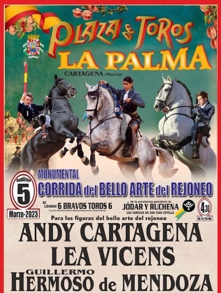 Las fiestas patronales de La Palma han regresado en plenitud, incluyendo su tradicional corrida de rejoneo, que en esta ocasión (s.e.u.o.) supondrá el primer espectáculo en torno al mundo del toro que se celebre en nuestro municipio desde que se desató la pandemia en España. Andy Cartagena, Lea Vicens y Guillermo Hermoso de Mendoza serán los protagonistas de la tarde del 5 de marzo.