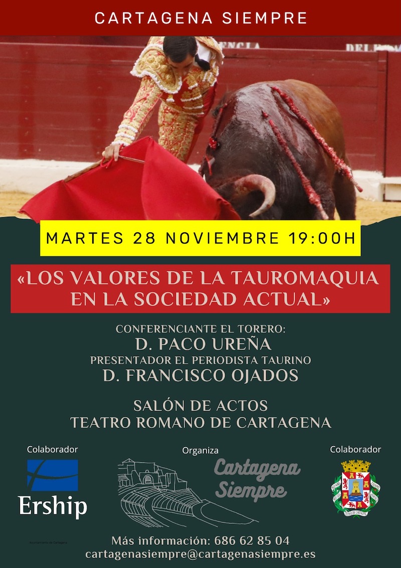 Es el título de la conferencia que organiza la asociación cultural 'Cartagena siempre' esta tare en el salón de actos del Teatro Romano, a partir de las 19 horas, con el torero Paco Ureña como conferenciante, siendo el presentador del acto el periodista taurino Francisco Ojados.