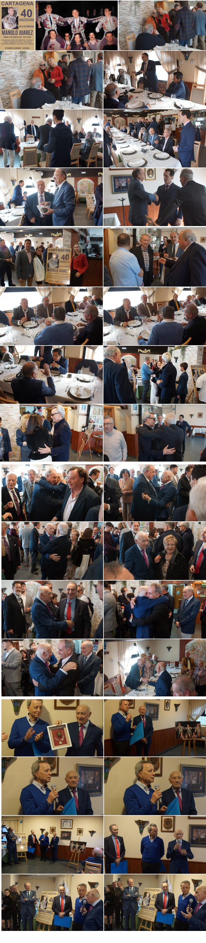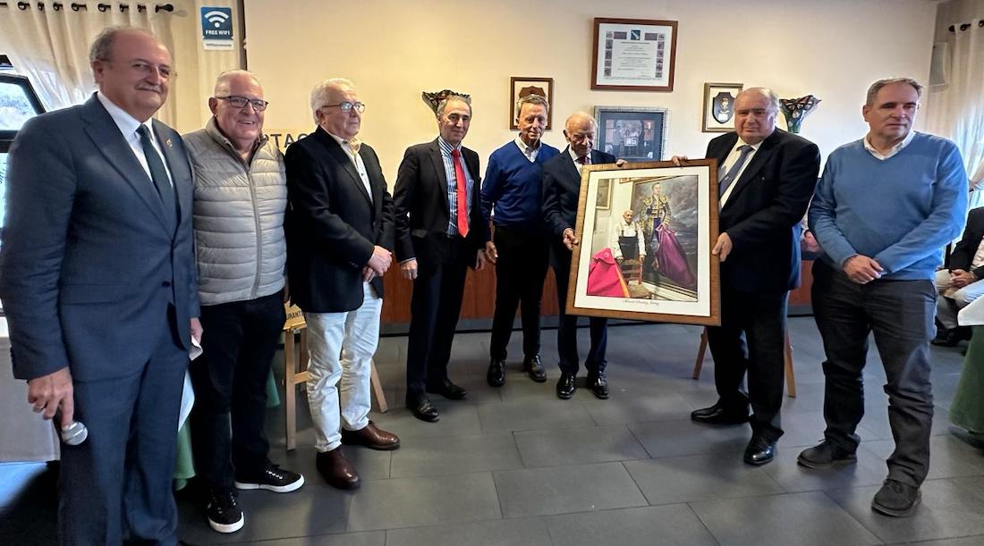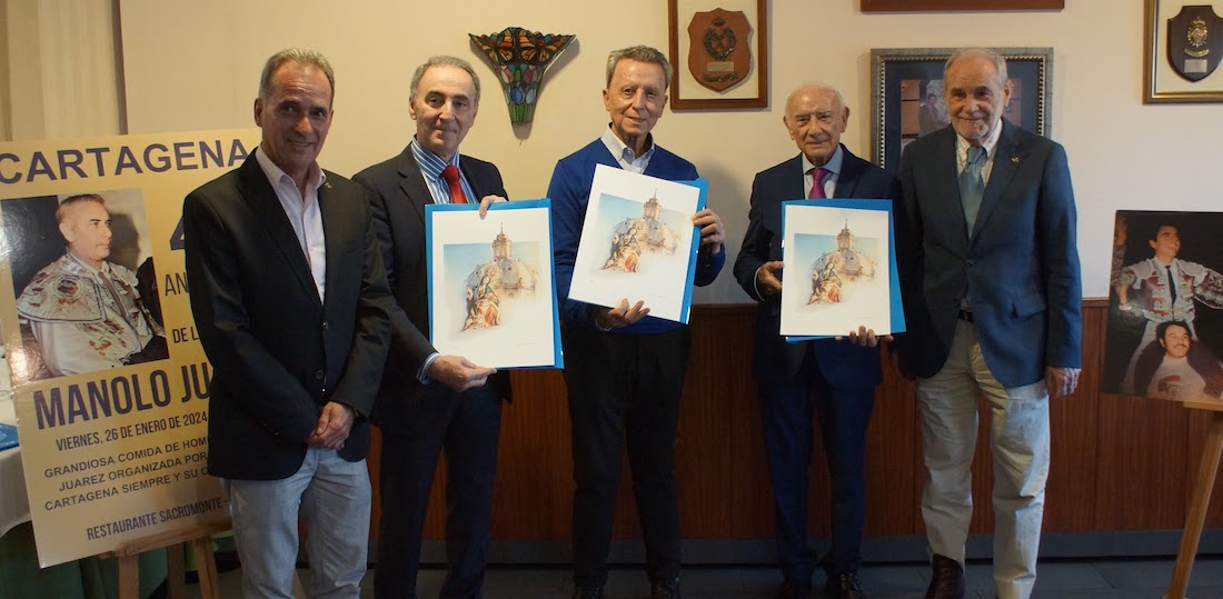 El maestro Juárez es el decano de los matadores murcianos. Durante la comida se le agasajó en numerosos momentos. Uno de los obsequios recibidos fue una foto de gran tamaño enmarcada con doble imagen de Juárez, reflejado en un lienzo del artista cartagenero Juan de la Cruz y, junto al cuadro con el capote tras una silla.