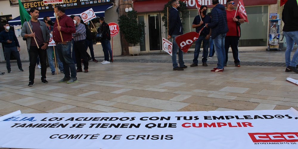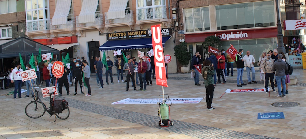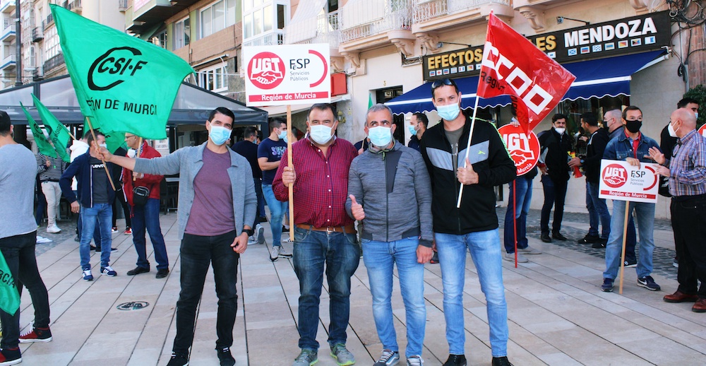 Funcionarios municipales, en convocatoria de los sindicatos UGT, CSI-F y CCOO, ha protagonizado una sonora concentración frente al Palacio Consistorial esta mañana mientras que en el interior del edificio se celebraba la sesión mensual de la corporación.