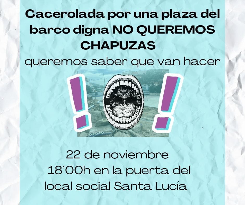 La asamblea extraordinaria convocada ayer por la asociación vecinal, con el lema 'No queremos chapuzas. Por una 'plaza de la barca' en condicioens y digna. No somos ciudadanos de segunda', concluyó con la aprobación por unanimidad de llevar a cabo hoy, a las 18 horas, una protesta con cacerolas en la puerta del local social, ubicado junto a la plaza en cuestión.