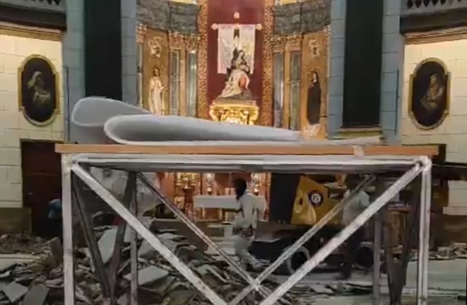 Han comenzado los trabajos para renovar las losas de la Real Basílica Menor que lleva el nombre de la patrona de Cartagena y sorprende que obras pictóricas, recientemente restauradas y de gran valor histórico, como las pinturas de Wssell de Guimbarda y la escultura de la Virgen de la Caridad, no se hayan cubierto al romper el suelo, lo que está llena todo de tierra y polvo.