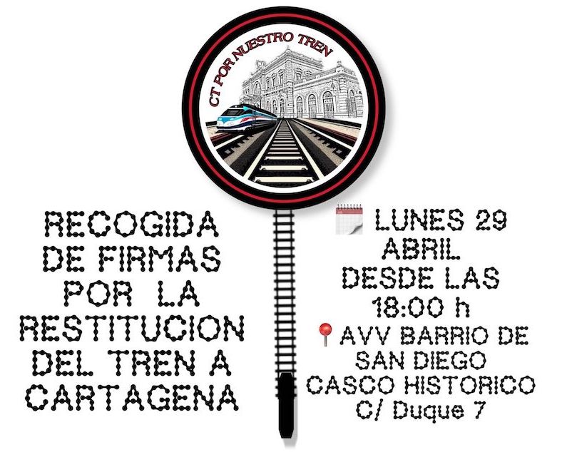 Asociación Despierta Cartagena, Asociación Cartaginense, Federación de Asociaciones de Vecinos de Cartagena y Comarca y Asociación de Vecinos del Barrio de San Diego llevarán a cabo una recogida de rúbricas este próximo lunes, a partir de las seis de la tarde, en la sede vecinal del casco histórico en la calle del Duque para reclamar que se restituya plenamente el servicio ferroviario en Cartagena.