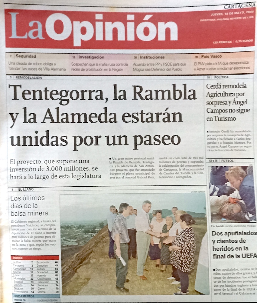 Fue en el mes de mayo del año 2000 cuando el entonces presidente autonómico, Ramón Luis Valcárcel, se desplazaba a la diputación de El Beal para anunciar que se iban a invertir 890 millones para eliminar la balsa minera. Han pasado 24 años y ahí sigue, viendo pasar el tiempo. La imagen ofrece la noticia en portada que ofreció el diario La Opinión de Murcia con foto de Javier Conesa.