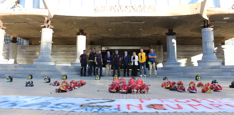 La foto muestra a los bomberos con el secretario general del PSRM-PSOE, José Vélez, esta mañana. Los bomberos denuncian la falta de efectivos para atender, con unos mínimos de seguridad, las diversas emergencias para las que son requeridos. Afirman que los parques de bomberos regionales no tienen el personal mínimo necesario tanto para garantizar la seguridad de la ciudadanía ante una emergencia como la de los propios bomberos cuando prestan servicio. Hace más de dos años, López Miras se comprometió a incorporar los 120 efectivos que demandaban los bomberos, y no lo ha hecho, dicen.
