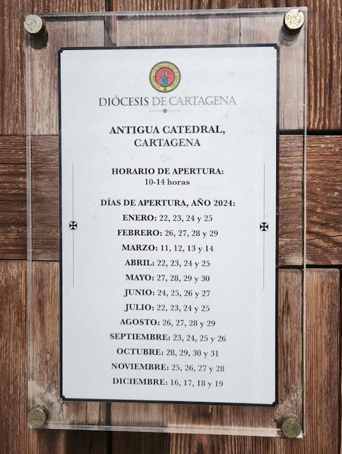 La Asociación Cultural Despierta CT denuncia el incumplimiento de la actualización del horario de apertura de Santa María La Vieja de Cartagena, que sigue exhibiendo la informacion del l año 2024, pese a que la normativa exige su actualización y exposición en un lugar visible. El colectivo pide a las autoridades que también exijan la subsanación a la diócesis.