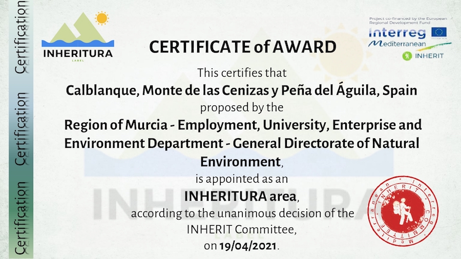 La Comunidad Autónoma obtiene el reconocimiento para el parque como área de turismo sostenible y protector del patrimonio natural. Esta distinción también abarca a Peña del Águila y al monte de las Cenizas.El director general del Medio Natural, Fulgencio Perona, anunció hoy que el Parque Regional de Calblanque, Peña del Águila y Monte de las Cenizas ha obtenido la etiqueta Inheritura, que acredita a este espacio natural como área donde se desarrolla el turismo de manera sostenible y participativa, protegiendo y poniendo en valor el patrimonio natural, por lo que pasa a ser la primera área Inheritura de España.