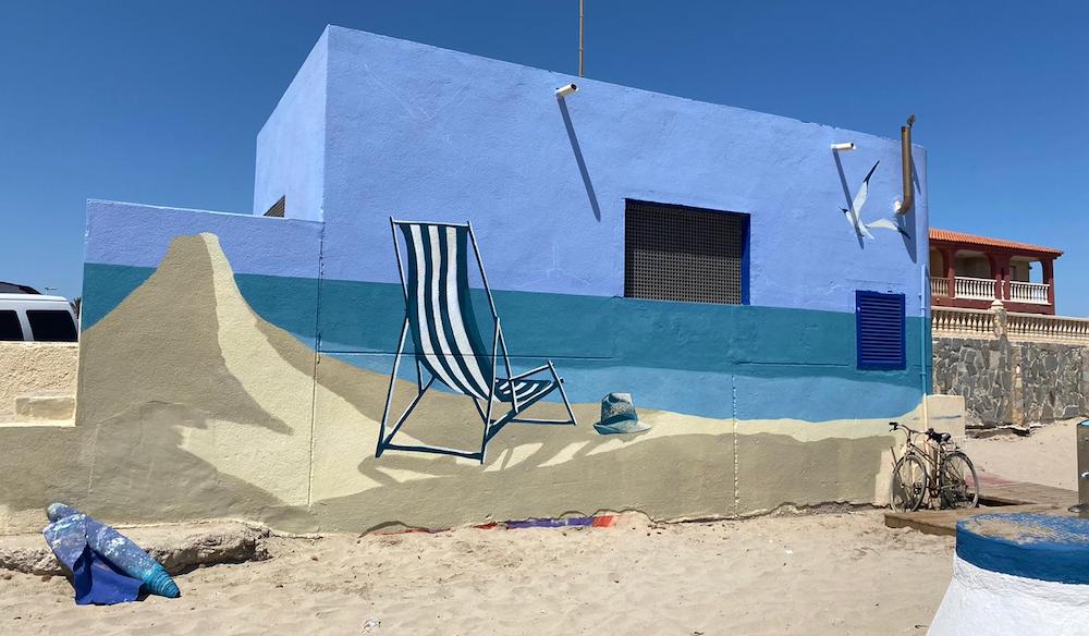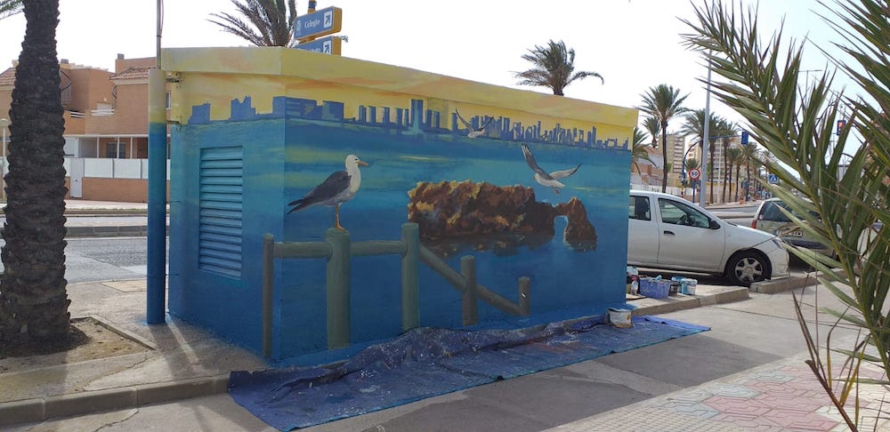 Y las pinturas realizadas en el bombeo Entremares representan las vistas desde la misma playa, donde se observa el Faro de Cabo de Palos, las Islas Hormigas e incluso, a lo lejos, se distingue la Isla Grosa.