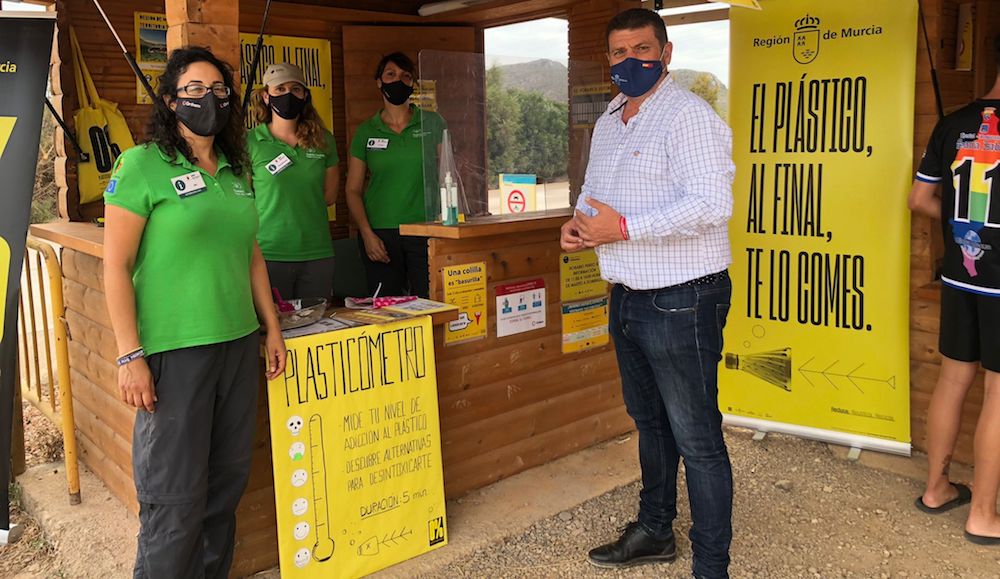 El director general de Medio Natural, Fulgencio Perona, ha visitado el acceso del Parque regional de Calblanque donde se desarrolla esta actividad enmarcada en la campaña ‘0% Plásticos en Espacios Protegidos de la Región de Murcia’, la cual se extenderá hasta el 29 de agosto y nace como medida de sensibilización y concienciación ambiental frente a la creciente problemática global derivada del aumento de basuras marinas en nuestros mares y océanos. Una caseta informativa permite concienciar a los visitantes de nuestros espacios naturales protegidos de la importancia de reducir o abandonar el uso de plástico y utilizar materiales biodegradables o reciclables, y obsequiará a los participantes con una bolsa de tela con los logos de la campaña.