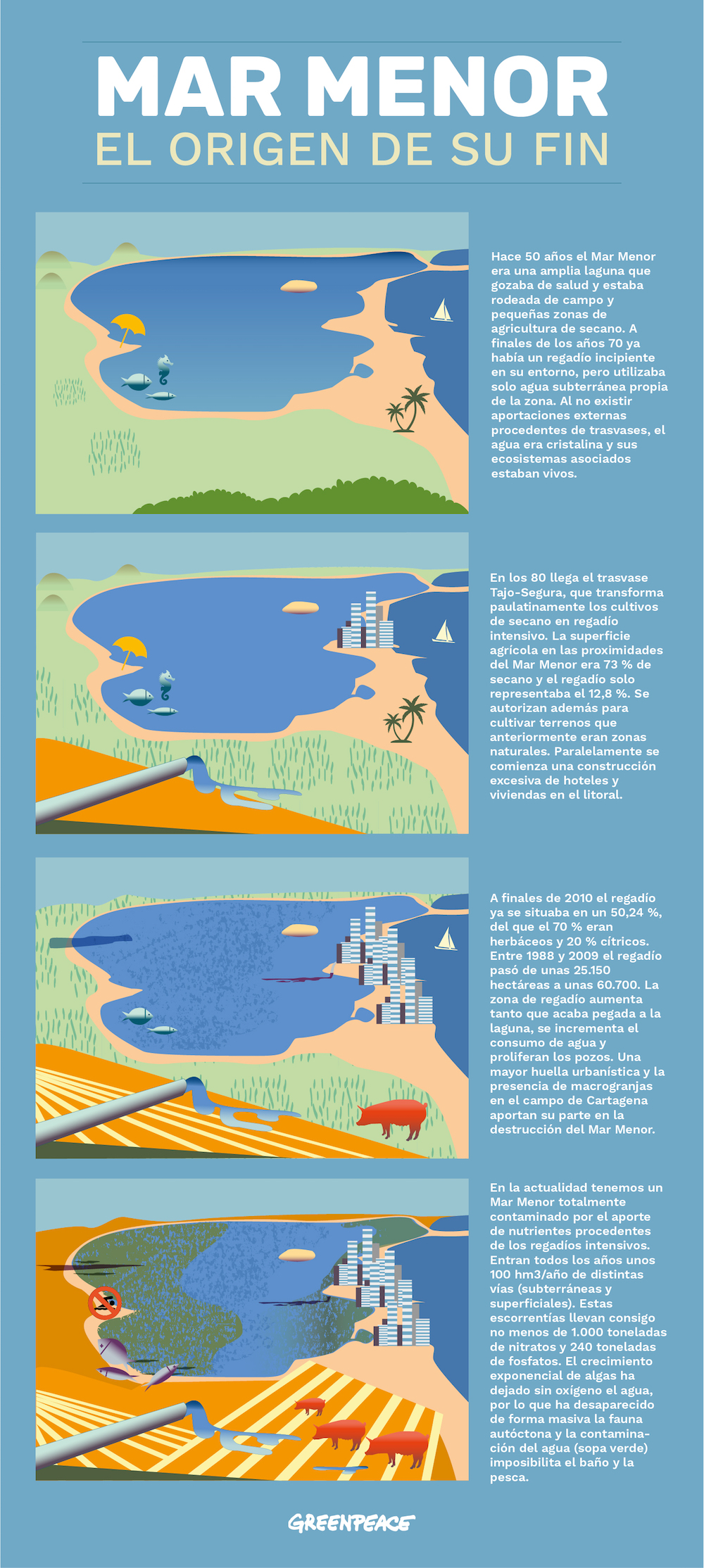 Greenpeace lanzaba esta misma semana un informe que señala el trasvase Tajo-Segura como el origen de la muerte de la laguna. Las conclusiones son claras: el exceso de agua, generado principalmente por el aporte de agua a través del trasvase Tajo-Segura, trajo consigo un desarrollo exponencial de la agricultura de regadío intensiva e industrial, basada en agrotóxicos, y su consiguiente contaminación de las aguas, que ha provocado la muerte de la mayor laguna salada de Europa.