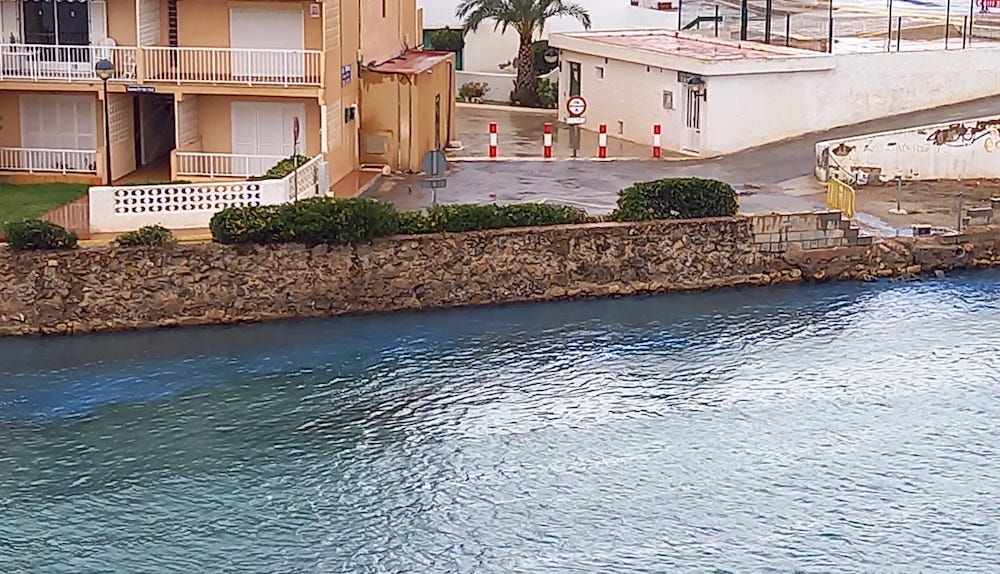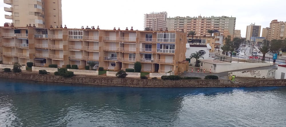 Vecinos de La Manga del Mar Menor han captado como la pintura azul acababa flotando en el canal y grupos ecologistas señalan que ha sido empujada por los operarios de la consejería de Fomento.