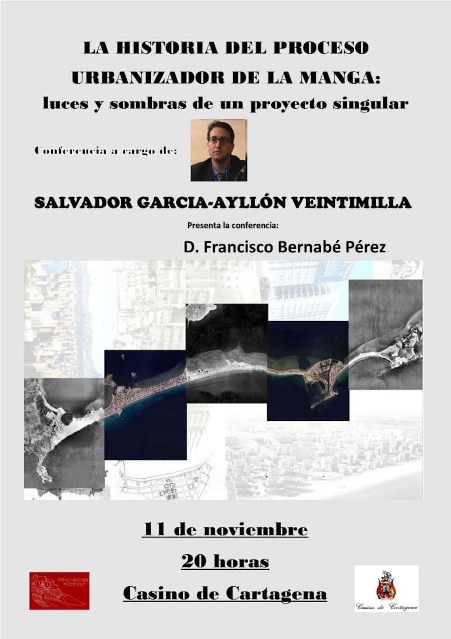'La historia del proceso urbanizador de La Manga: luces y sombras de un proyecto singular' es el título de la conferencia que cierra hoy el programa de las 'Jornadas culturales 2021' de la asociación cultural. Tendrá lugar en el Casino de la ciudad, a partir de las 20 horas, a cargo de Salvador García-Ayllón Veintimilla, con presentación a cargo del senador Francisco Bernabé Pérez.