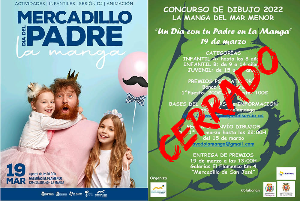 La Manga celebra el Día del Padre con un mercadillo, que se ubicará en Galerías El Flamenco desde las 10 de la mañana y con un concurso de dibujo para los más pequeños. Además, se recogerán donaciones para Ucrania.