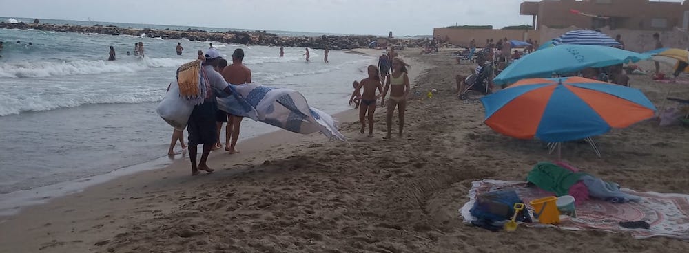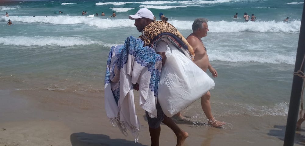 El hombre que va vendiendo vestidos y mantas por la playa, ofreciéndolos a los bañistas, es una imagen que se da desde hace (muchas) décadas y que no podía faltar este año, como refleja esta fotografía tomada en el ‘Mar Mayor’ de La Manga.