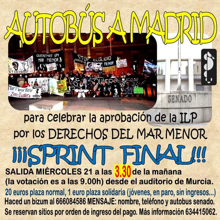 El próximo miércoles 21, a las 3.30 de la mañana, partirá un autobús hacia Madrid para celebrar la aprobación de la ILP por los derechos del Mar Menor. El autobús saldrá desde el auditorio de Murcia para llegar a Madrid a las 9.00 horas. El precio de una plaza normal es de 20 euros mientras que la plaza solidaria será de 1 euro (para quienes se encuentren en paro, sin ingresos, jóvenes...)