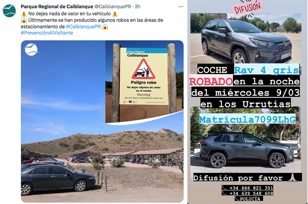 Los casos más recientes se han dado zonas de costa, en concreto, en el área de estacionamiento del parque regional de Calblanque y en varios establecimientos de Los Urrutias (uno de los casos es la foto adjunta), además de un vehículos que ha sido sustraído y del que sus propietarios han difundido fotos. En estos dos últimos casos, además de exigir más seguridad a las autoridades, se solicita la colaboración ciudadana.