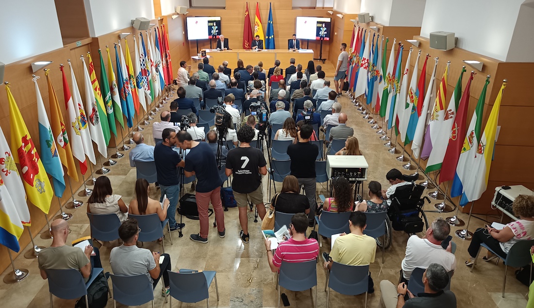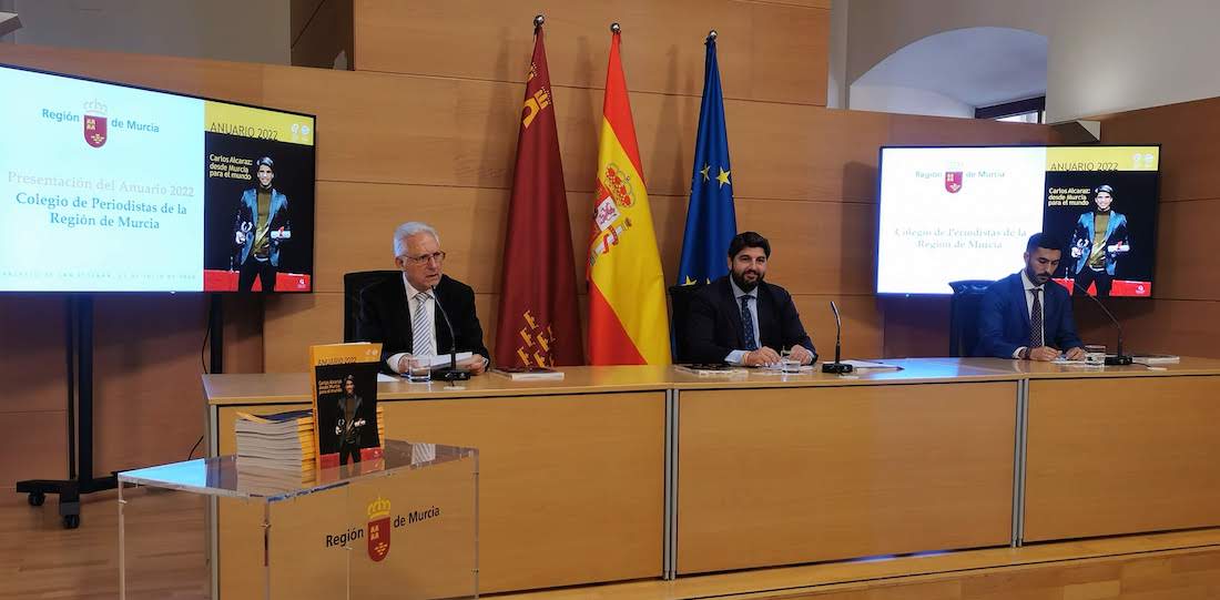 El Colegio Oficial de Periodistas ha presentado el Anuario de la Región de Murcia 2022, en el Palacio de San Esteban, con asistencia del presidente en funciones, Fernando López Miras, la presidenta de la Asamblea Regional, Visitación Martínez, y el delegado del Gobierno, Francisco Jiménez, entre otras autoridades. En la presentación han intervenido, además del presidente en funciones de la Comunidad Autónoma de la Región de Murcia, el decano del Colegio de Periodistas, Arturo Andreu, y el nuevo director del Anuario, Ángel Blasco Lozano.