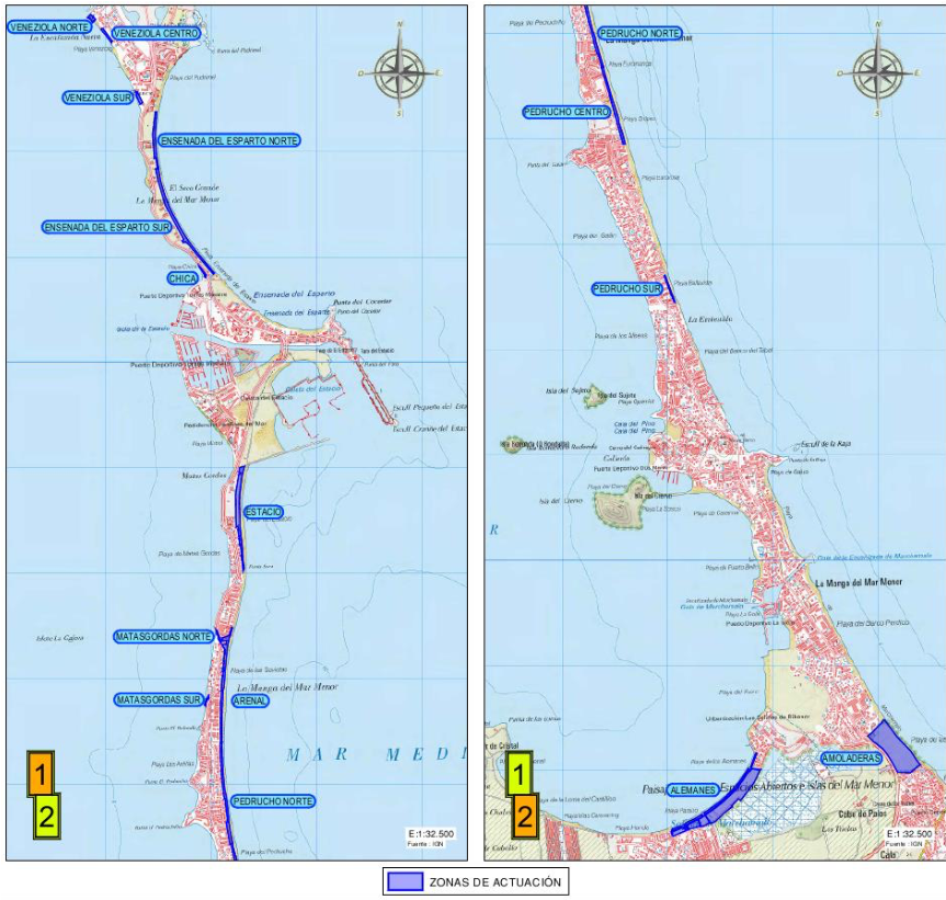 Esta intervención, cuyo plazo de ejecución se eleva a 24 meses, contempla actuar en una quincena de espacios dunares comprendidos a lo largo de toda la barra costera de La Manga, entre la playa de Los Alemanes, colindante con las salinas de Marchamalo, y la playa de Veneziola, al final del cordón litoral.
