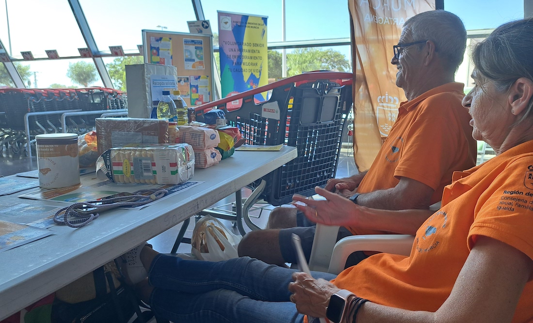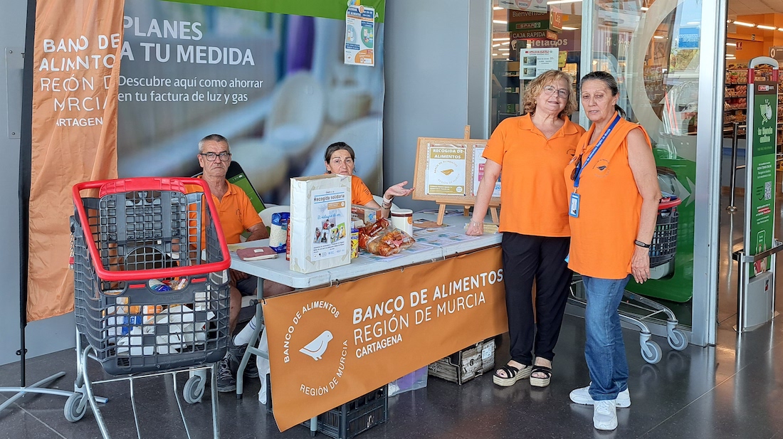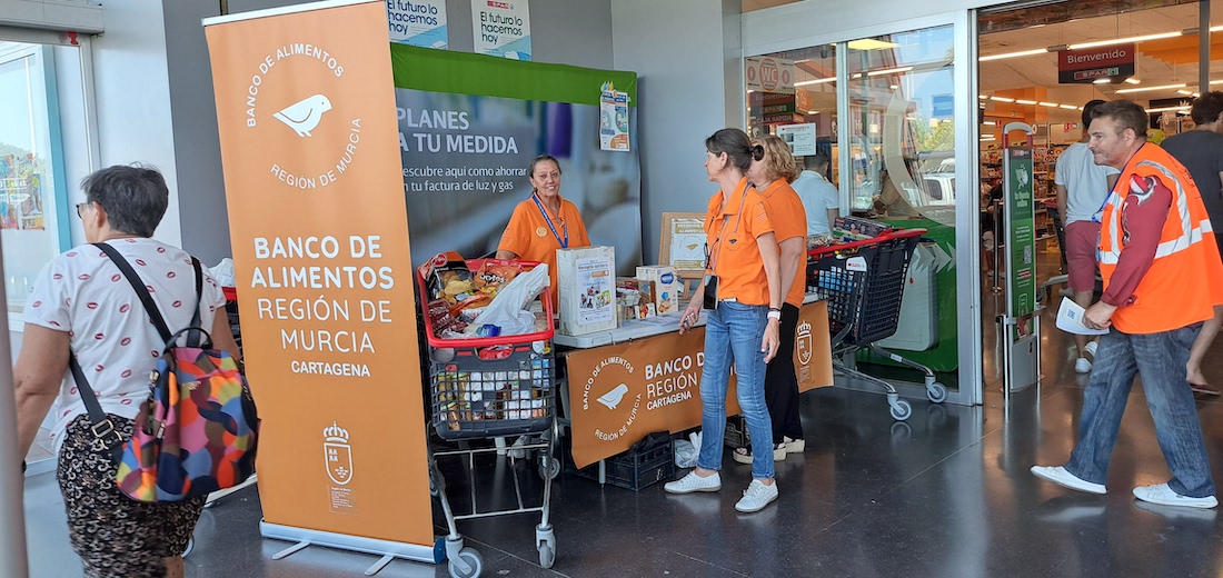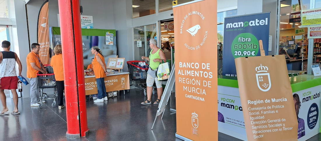Las personas que trabajan de forma desinteresada en el Banco de Alimentos de la Región de Murcia de Cartagena siguen con su labor durante la época estival en el almacén de La Palma y desplazándose a diversos puntos del municipio, como el UPPER de Cabo de Palos, lugar al que corresponde las fotografías adjuntas, para recoger alimentos que tienen como destino final a personas necesitadas.
