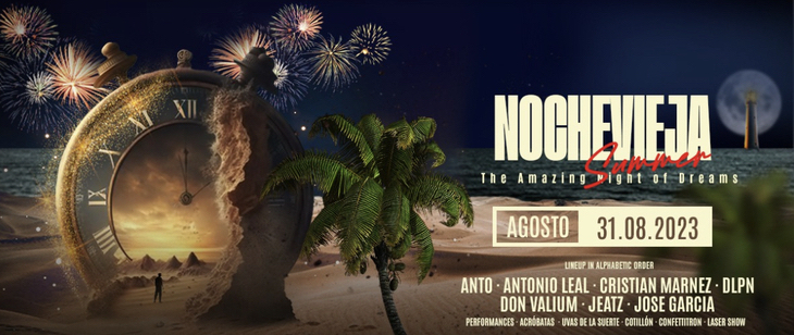 Es la fiesta que anuncia Trips para el 31 de agosto, con entradas a 27 euros. Además de cotillón y uvas de la suerte, habrá perfomances, acróbatas y espectáculo de láser. Actuarán Anto, Antonio Leal, Cristian Marnez, Dlpin, Don Valium, Jeatz y José García.