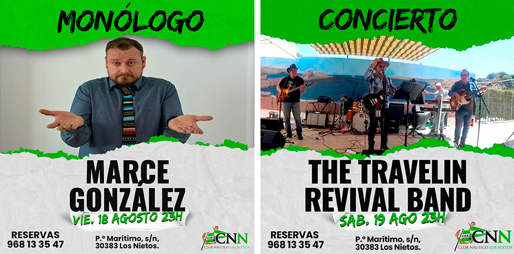 Marce González lleva esta noche (23 horas) el humor al club náutico, donde el sábado hay en la terraza baile de disfraces para adultos (22.30 horas) y la música en directo de 'The Travelin Revival Band'. La foto muestra una salida de las regatas de vela latina que el club organiza en el Mar Menor, habiendo sido 'Perla negra' el vencedor de las dos celebradas este mes.
