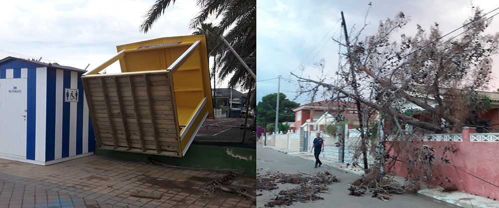 En el litoral este se intervino en Cabo de Palos para la retirada de ramas con motivo de la caída de un árbol sobre varios vehículos. También hubo que sanear cerca de Las Amoladeras una valla con riesgo de caída. En La Manga también hubo daños materiales por la caída de una palmera en el interior de la parcela de una vivienda. Más palmeras sufrieron daños, teniendo que ser retiradas de la vía pública. En La Manga también se recogieron numerosos contenedores de basura, que se habían desplazado de su emplazamiento como consecuencia del fuerte viento. Asimismo, se volcó una caseta en el paseo de Mar de Cristal y hubo que intervenir en un poste luz que se inclinó hacia una vivienda de Los Nietos.
