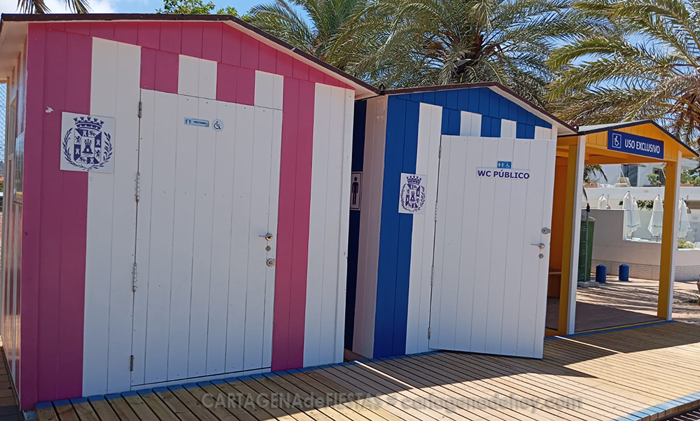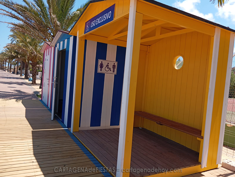 Las casetas para aseo y vestuario que el año pasado estaban en zonas como La Manga se están extendiendo por otras playas cartageneras, como Mar de Cristal, que son las que muestra la imagen. Su uso es gratuito y son limpiadas a diario.