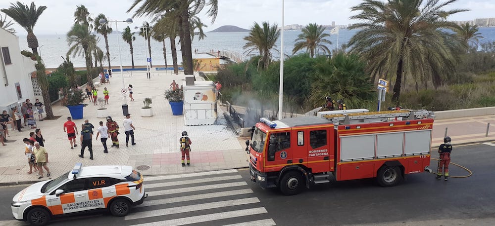 Efectivos de bomberos tuvieron que intervenir ayer en el pueblo marmenorense por las llamas en una plaza próxima a la playa y junto a un quiosco. El origen, según se baraja, podría estar entre la imprudencia o intencionalidad de alguien.