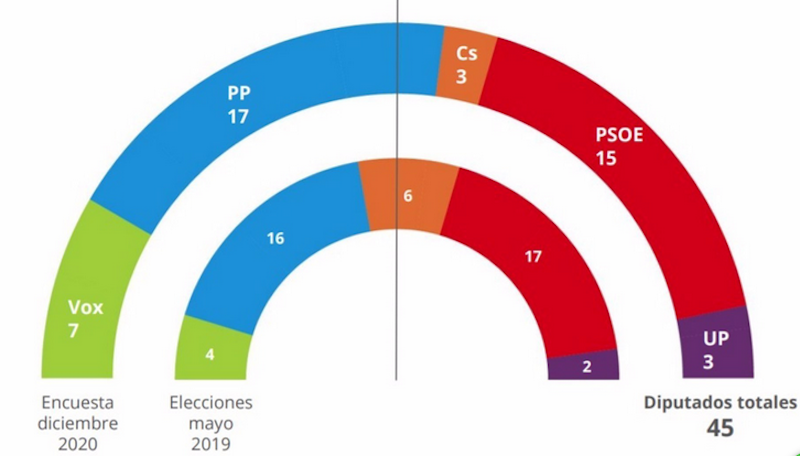 El PSOE se mantiene en segunda posición, pero continúa la tendencia a la baja, perdiendo 3 puntos respecto al mes de diciembre y cae hasta los 13 diputados, perdiendo 4 respecto a las elecciones de 2019.
