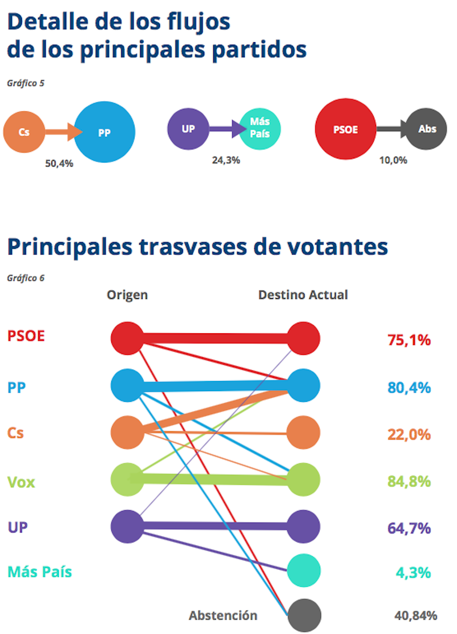 El Barómetro recoge la entrada de un nuevo partido en la Asamblea Regional, Más País. Este partido, impulsado por sus resultados en las autonómicas madrileñas, obtiene sus votos de electores procedentes del PSOE y de Podemos.