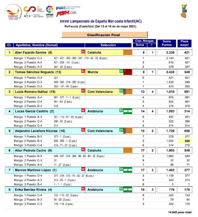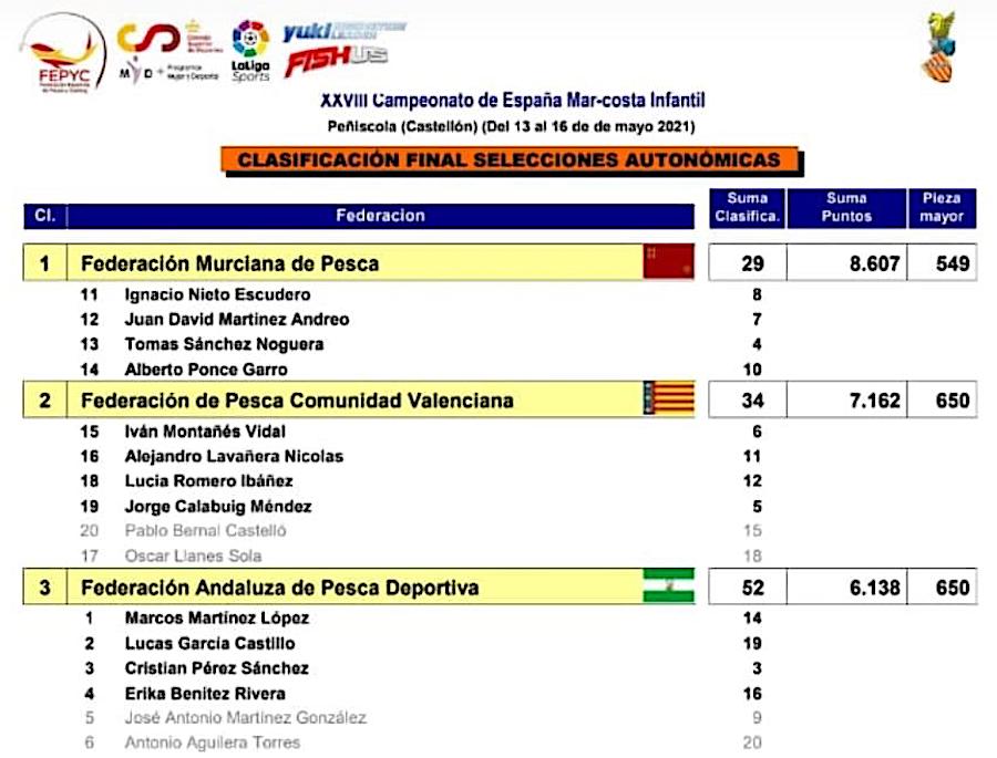 El equipo de la Región de Murcia ha sido primero, superando a las comunidades valenciana y andaluza, en la categoría infantil con el equipo formado por Ignacio Nieot, Juan David Martínez, Alberto Ponce y Tomás Sánchez Noguera, vecino de Perín y que ha enriquecido aún más su gran actuación con el segundo puesto en la clasificación final en la modalidad individual infantil. Fue precedido en la clasificación por Alan Fajardo Santos (Cataluña), mientras que tercero quedó Lucía Romero (Comunidad Valenciana).