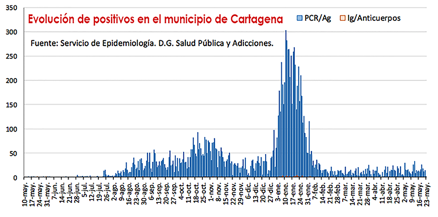 En el último mes, Cartagena lleva registrados 393 casos positivos de COVID-19. Por grupos de edad, la mayoría de casos se da en la franja de 15 a 29 años de edad con 117. Los restantes son 40-49 años (69 casos), 5-14 (67), 50-59 (34), 2-4 (24), 60-69 (17), 70-79 (9), hasta dos años (9) y mayores de 80 (1).