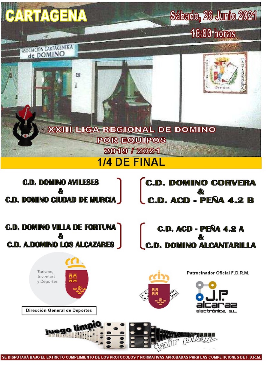 La federación autonómica informa que, ante la imposibilidad de utilizar las instalaciones del centro social de Balsapintada (Fuente Álamo), la sede de los cuartos de final del XXIII campeonato por equipos (2019/21) se celebrará el sábado 26 de junio en el local social del CD Asociación Cartagenera de Dominó desde las 16 horas. Nuestro municipio está representado por los dos equipos de la ACD Peña 4.2.