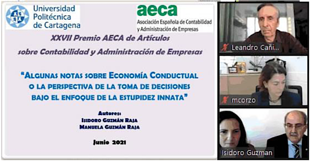 La Asociación Española de Contabilidad y Administración de Empresas (AECA) reconoció el trabajo “Algunas notas sobre economía conductual o la perspectiva de la toma de decisiones bajo el enfoque de la estupidez innata” de Isidoro Guzmán Raja, Profesor Titular de la UPCT, y Manuela Guzmán Raja, Doctora en ADE de la Universidad Politécnica de Cartagena, con el XXVII Premio AECA de Artículos sobre Contabilidad y Administración de Empresas.