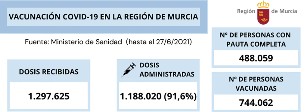 El presidente de la Comunidad, Fernando López Miras, anunció hoy, durante la primera sesión del 'Debate sobre el estado de la Región', que la vacunación en la Región incluirá desde el mes de agosto el tramo de edad de entre 12 y 29 años, a través de autocita. Asimismo, informó de que “hemos superado ya el millón de dosis administradas, a pesar de la desinformación y los bandazos por parte del Ministerio de Sanidad. Sólo en junio habremos administrado 523.000 dosis, lo que es un hito para nuestro sistema”. Los inmunizados en la Región ya están en el medio millón, la tercera parte de la población.