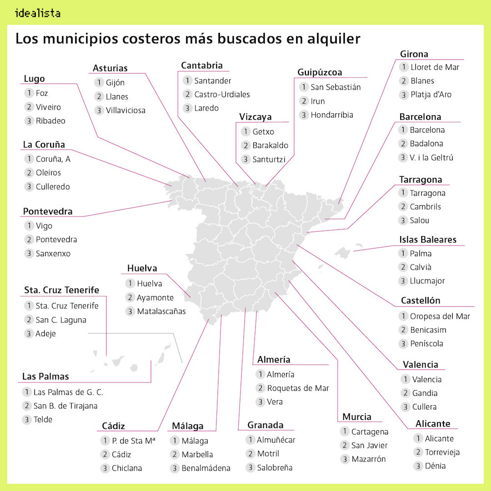 Las zonas de costa suelen contar con un mercado de la vivienda activo, tanto en compraventa como en alquiler. Mediante el promedio de visitas mensuales durante el segundo trimestre de 2021, en idealista hemos elaborado este ranking de municipios más buscados en las provincias costeras para alquilar una vivienda. En las 21 provincias costeras españolas la capital es el municipio con mayor demanda, pero hay alguna sorpresa.