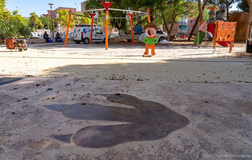 “Además, se ha renovado toda la zona de juegos infantiles y se han incluido equipos de biosaludables para los mayores. Por otra parte, en las dos salidas principales se han colocado letras texturizadas de hormigón en blanco con la denominación del parque. Los caminos interiores se han decorado con adoquines formando huellas de dinosaurio continuando con la estética del resto del espacio”, ha señalado el edil.