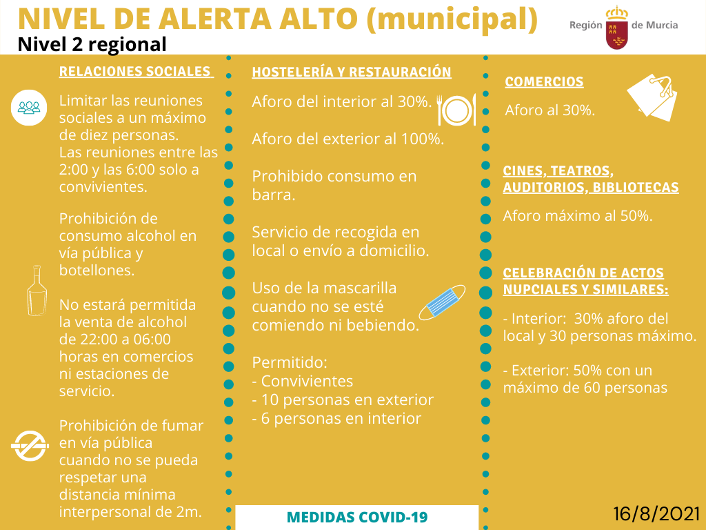 En cuanto a la situación municipal, Albudeite se encuentra en Nivel de Alerta 1-Bajo. Abanilla, Blanca, Bullas, Fuente Álamo, Ojós y Pliego están en nivel 2-medio. Los 38 municipios restantes se sitúan en nivel de Alerta 3-Alto.